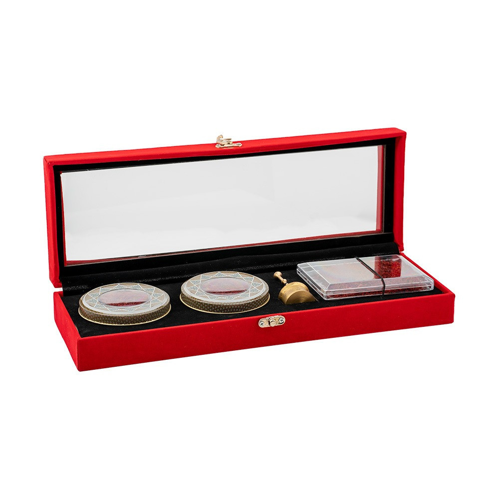هدية مناسبات (2): صندوق مخمل أنيق بغطاء زجاجي شفاف يحتوي على علبتين معدنية (10 جرام زعفران سوبر ملكي + 10 جرام نقيل فاخر) + علبة زجاجية تحتوي 4 جرام زعفران أبو شية + نجر الزعفران ميني ..